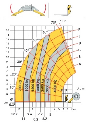 Haulotte HTL 4017 Capacità massima di carico 4000 Kg. Portata max a massima altezza 2500 Kg. Portata max a massimo sbraccio 700 Kg. Altezza massima sollevamento 16,70 Mt. Sbraccio massimo 12,85 Mt. Velocità 0,5 - 5,5 Km/h Trasmissione Idrostatica Peso Kg.12000 ![]() | Area lavoro Haulotte HTL 4017 con stabilizzatori abbassati![]() |